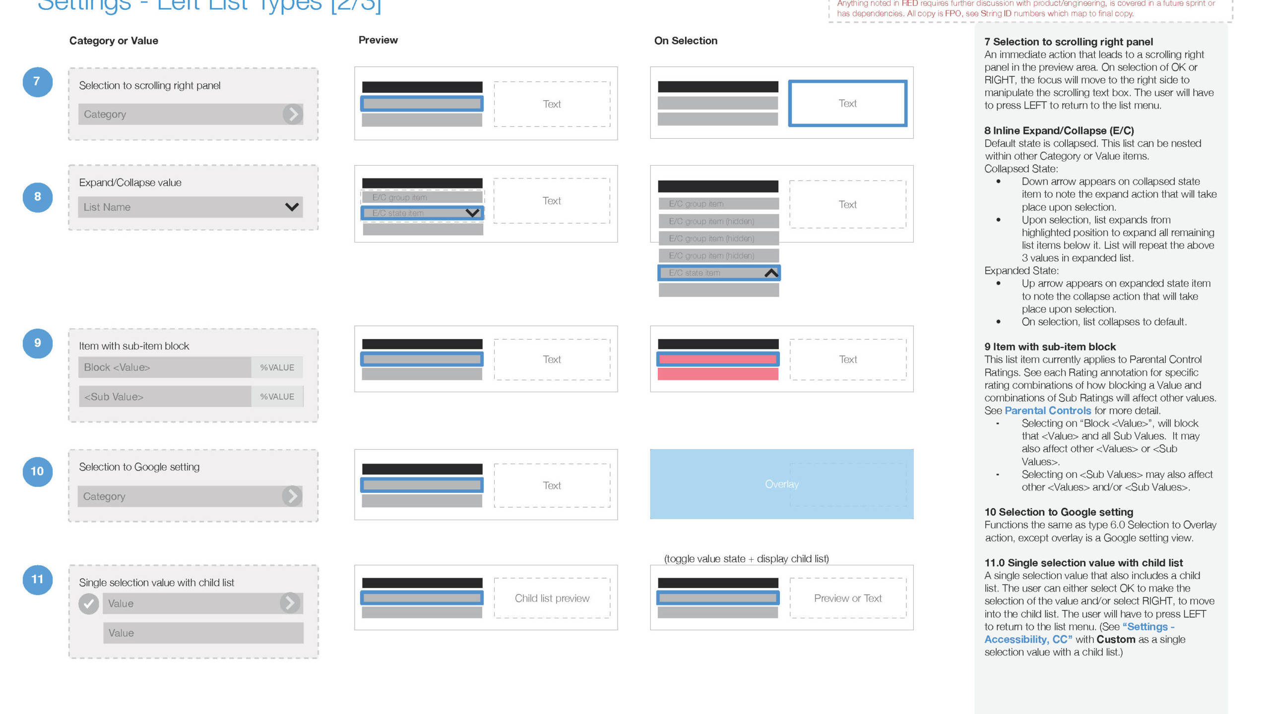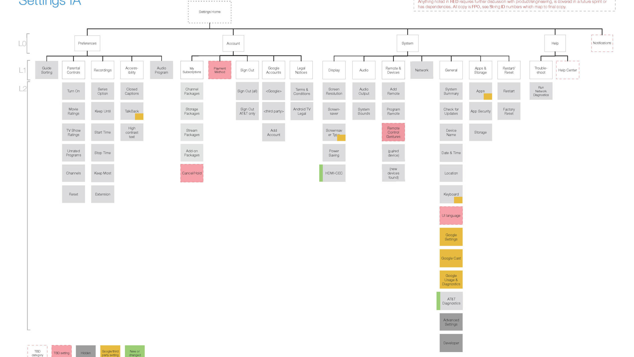 With AT&T TV based on Android TV there was quite a challenge in creating a new design for settings that aligned with the master application design and also supported all Android settings. Android default settings and custom AT&T settings were combined into a design structured to reduce the amount of scrolling and digging around that is usually necessary on devices. The custom settings application supports installing third party apps that require settings and can link out to Google services which have settings.
